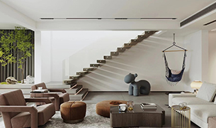 屋内宽大的窗户同样给予了空间充足的自然采光,百叶窗同样是透光不透景,保护隐私,双眼皮吊顶简洁大气,中间安装智能灯带增加氛围感与科技感。